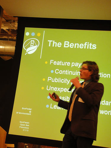 San Francisco’s aggressive open data efforts were on display this week, as civic and technology leaders took the stage at sf.govfresh, an event highlighting technology innovation in City government. City CIO Chris Vein (who also was recently interviewed by ideation solutions firm BrightIdea) and Department of Technology innovations manager Jay Nath explained how the City is leveraging innovators in and out of government to create a culture that creates valuable new applications at little to no cost. Jay’s presentation on Open 311 APIs is here.